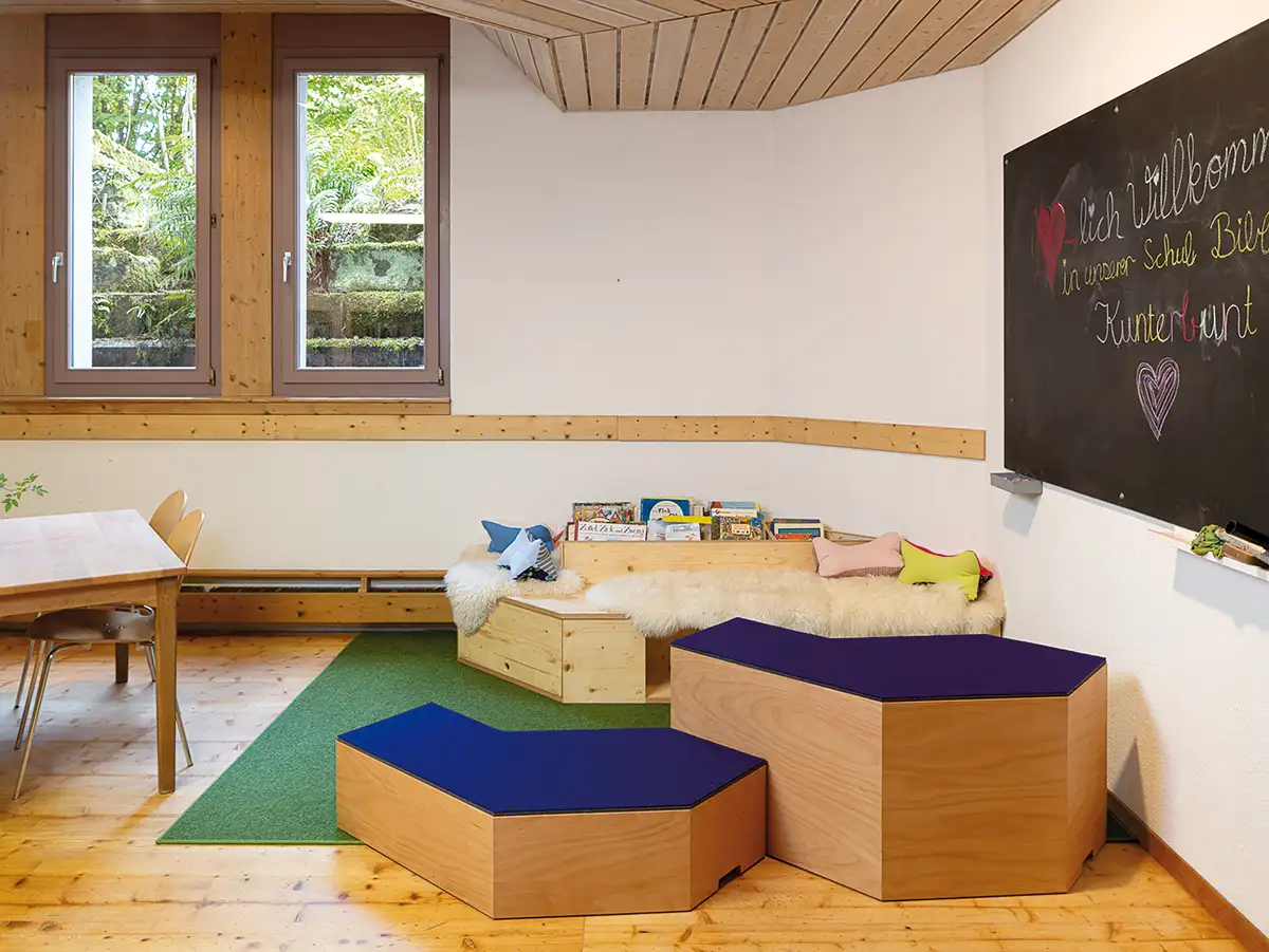 Ob Kinder eine Bibliothek gerne besuchen, hängt wesentlich auch davon ab, wie der Raum gestaltet ist. Deshalb achteten wir besonders darauf, die Inneneinrichtung sorgfältig auf die organische Architektur des Gebäudes abzustimmen und ansprechend zu gestalten. Wir fertigten Regale aus massiven Fichtenholzplatten an, die dem Raum Wärme verleihen und sich harmonisch einfügen. Ergänzt wurden sie durch eigens entworfene Sitzmöbel: Zwei leichte, flexibel einsetzbare Elemente mit identischem Grundriss, aber unterschiedlicher Höhe, die sich mühelos zu kleinen Erzähl- und Leseinseln arrangieren lassen.